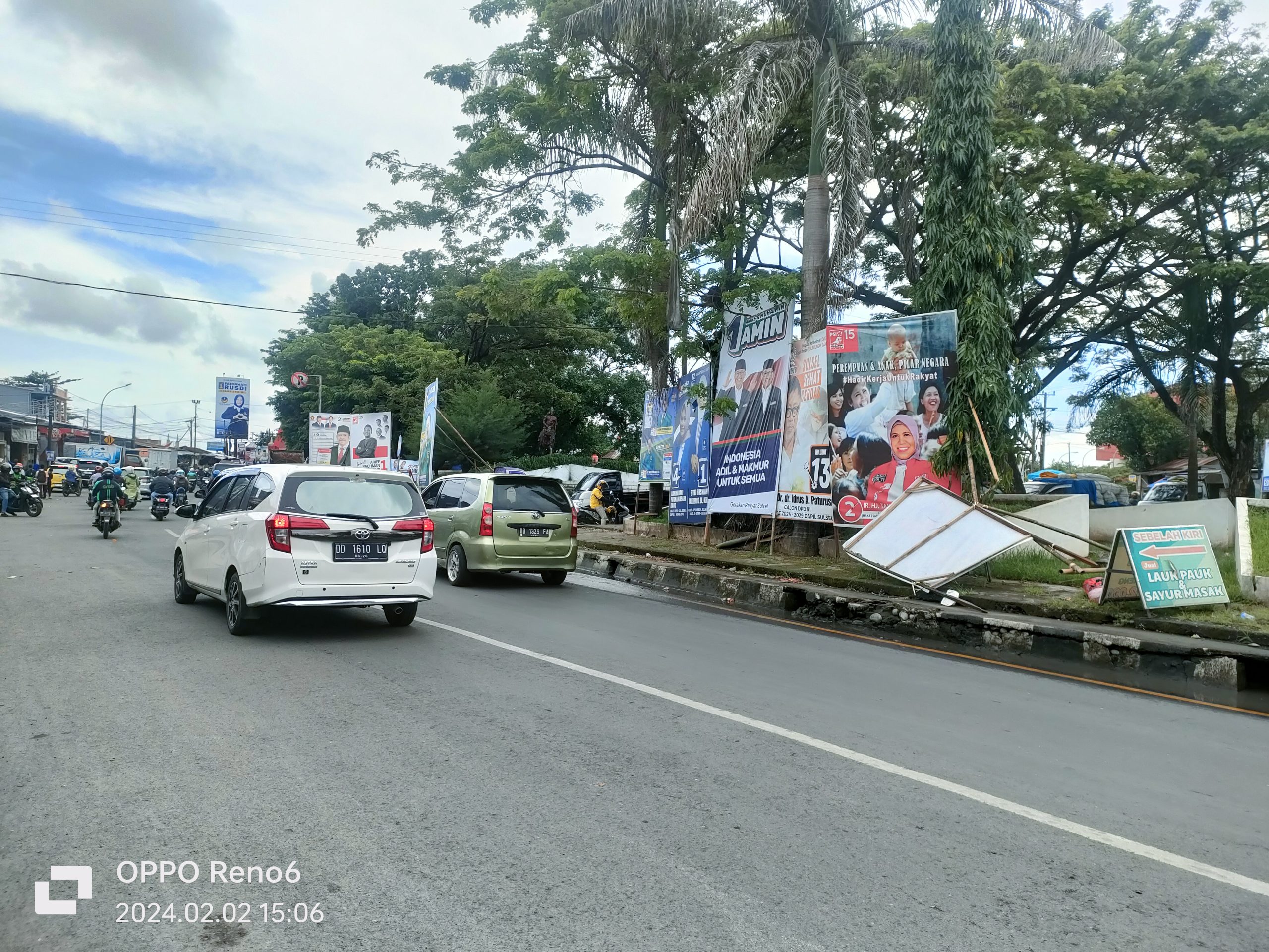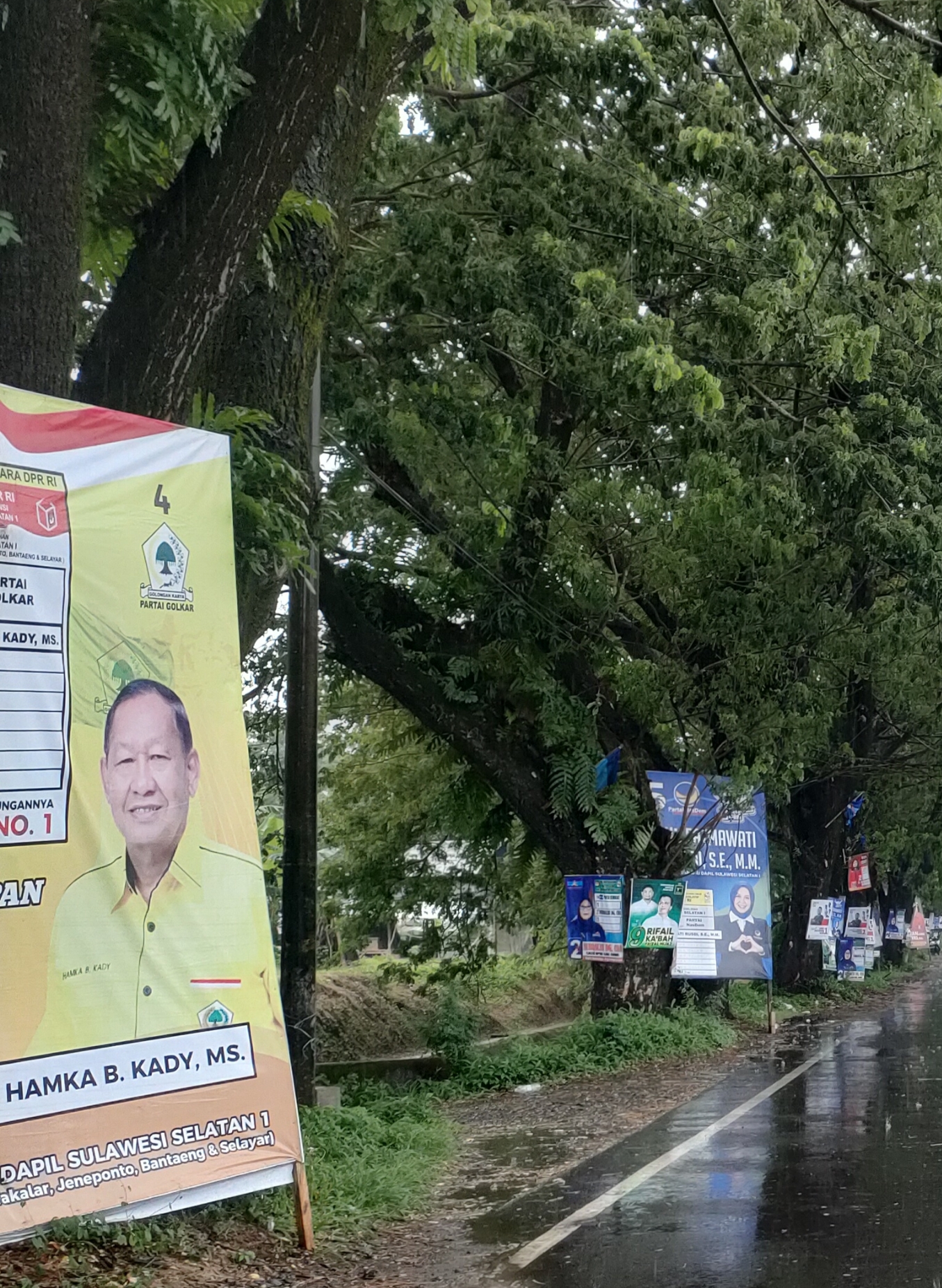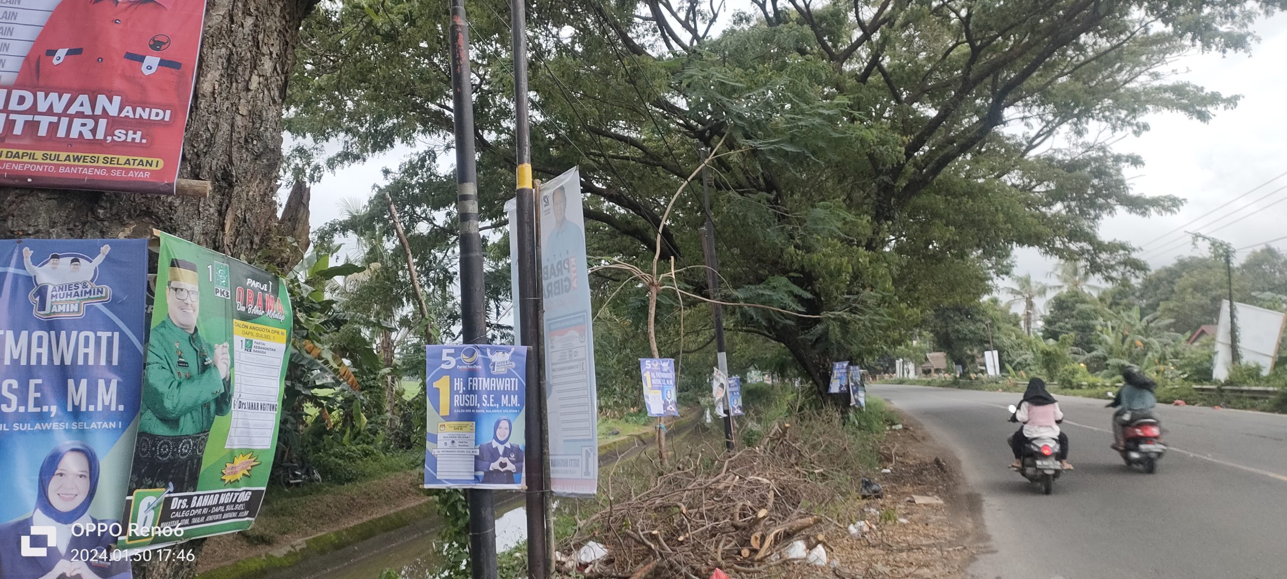 Spanduk dan banner caleg parpol masih terpasang di pohon-pohon hingga tiang listrik, jembatan kembar Sungguminasa Gowa. Pemandangan terlihat semrawut ini bisa terlihat di ruas-ruas jalan provinsi – Kabupaten Kecamatan dan ruas jalan desa/Kelurahan sampai di permukiman warga, tersebar di Kecamatan Bontonompo Gowa.