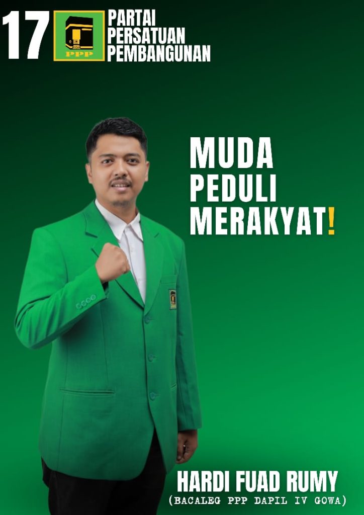 Bomwaktu.com, Gowa Sulsel — Hardi Fuad Rumi, SE, kelahiran, 2 Mei 1995, usia 28, tahun, maju di konstestan pilcaleg di usung Partai Persatuan Pembangunan (PPP) dapil Empat Bontolempangan – Bungaya – Biringbulu – Tompo Bulu dan Bontolempangan Kabupaten Gowa, Provinsi Sulawesi Selatan (Sulsel) tahun 2024.