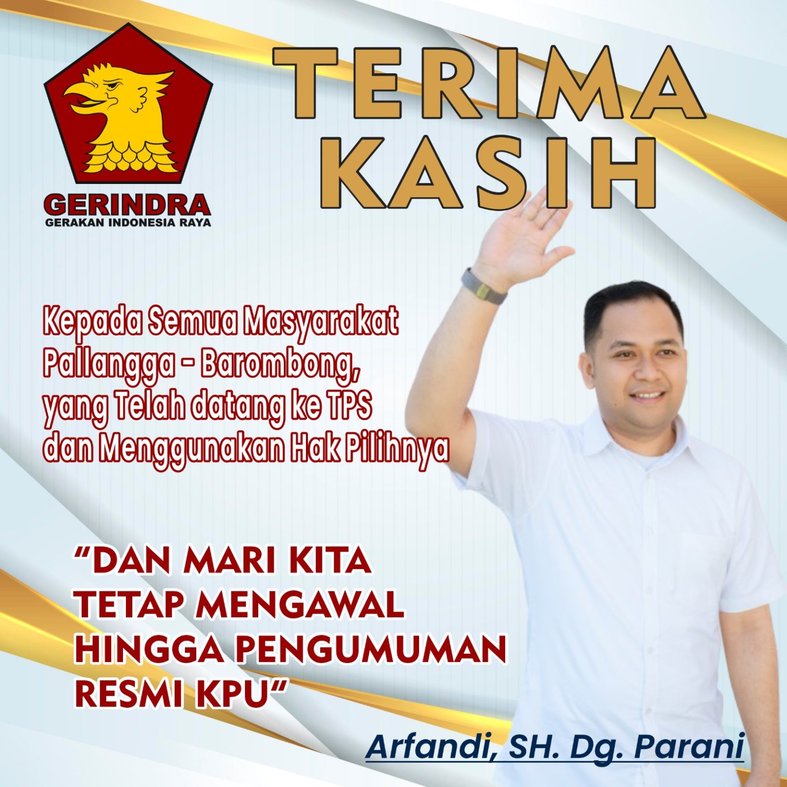 Bomwaktu.com Gowa Sulsel — Arfandi SH, Dg Parani, usia 32 tahun, Caleg nomor urut 2 DPRD Gowa Partai Gerindra bertarung di Daerah Pilihan (Dapil) 7 Pallangga Barombong Gowa, mendapatkan suara kurang lebih 4.160.