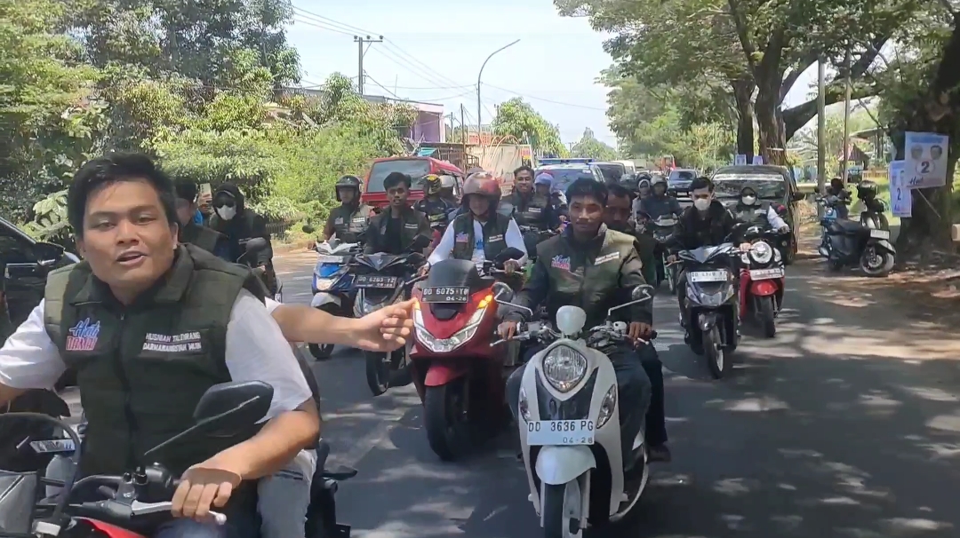 Iring iringan Rombongan motor yang di siapkan oleh tim “NN”, mengantar Hj. Husniah Talenrang, ke lokasi safari kampanye tatap muka terpusat di lapangan depan Kantor desa Bontolangkasa Selatan Kecamatan Bontonompo Gowa Rabu (6/11/24).