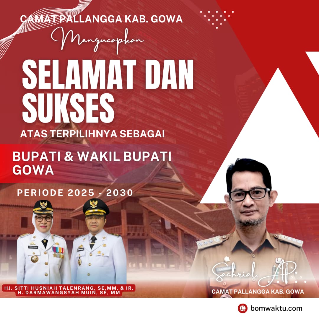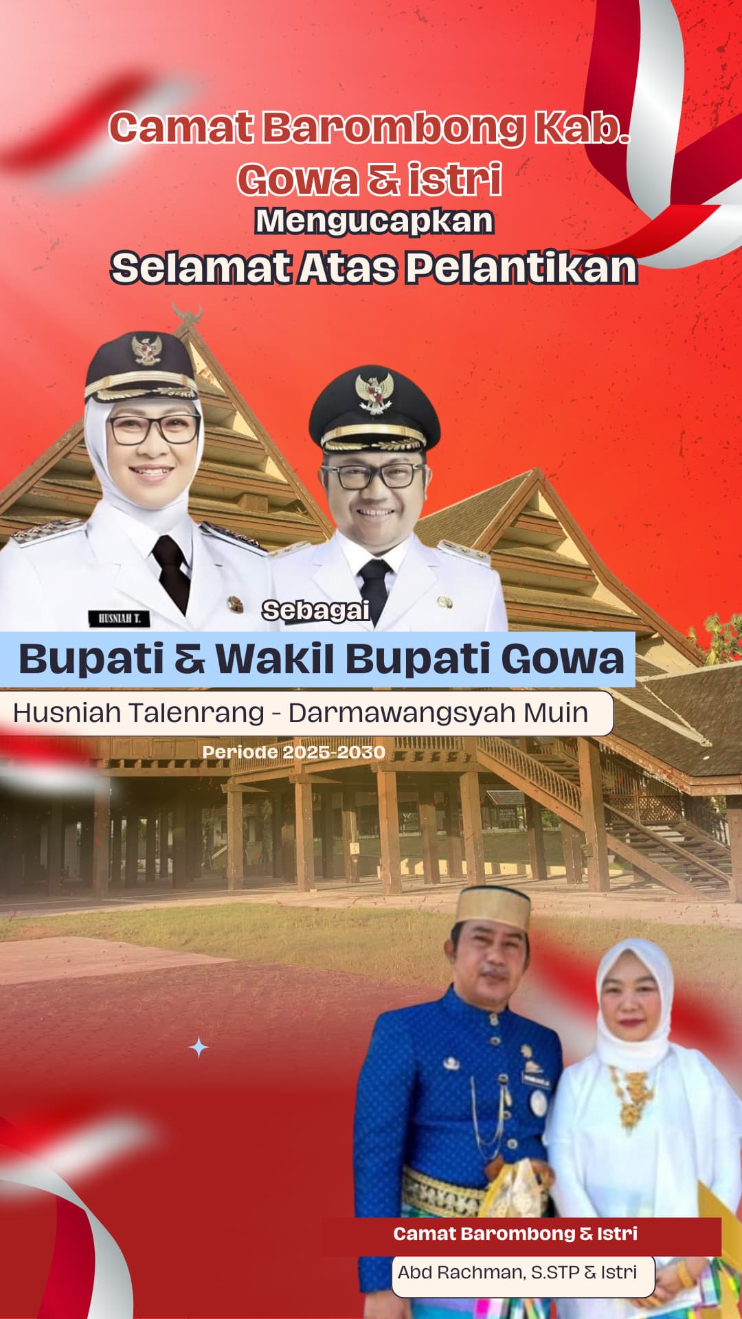 “Ucapan Selamat pun terpampang di depan Kantor Camat Barombong Gowa, dan Kecamatan Pallangga Gowa, menggunakan Baliho ukuran 2 x 1 dengan ucapan Selamat & Sukses atas Pelantikan Bupati Gowa, Dr. Hj. Husniah Talendrang, SE, MM, & Wakil Ir. H. Darmawangsyah Muin, ST, MM, Periode tahun 2025 – 2030.